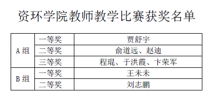 本届教师教学比赛共评选出A组一等奖1名、二等奖2名、三等奖3名,B组一等奖1名,二等奖1名。