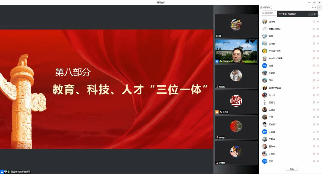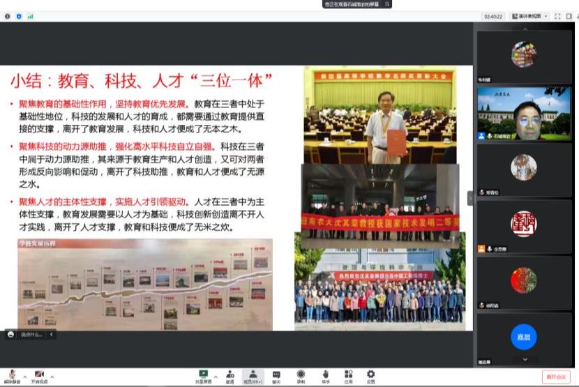 石诚副教授从党的二十大主题、主要成果,过去5年的工作和新时代10年的伟大变革,马克思主义中国化时代化,中国式现代化,全面建设社会主义现代化国家的目标任务,坚持党的全面领导和全面从严治党,应对风险挑战,教育、科技、人才“三位一体”等八个方面,对党的二十大精神特别是从“教育、科技、人才‘三位一体’”方面结合校史、院史资料和自己的研究成果及心得体会做了深刻的阐述和详细的解读。
