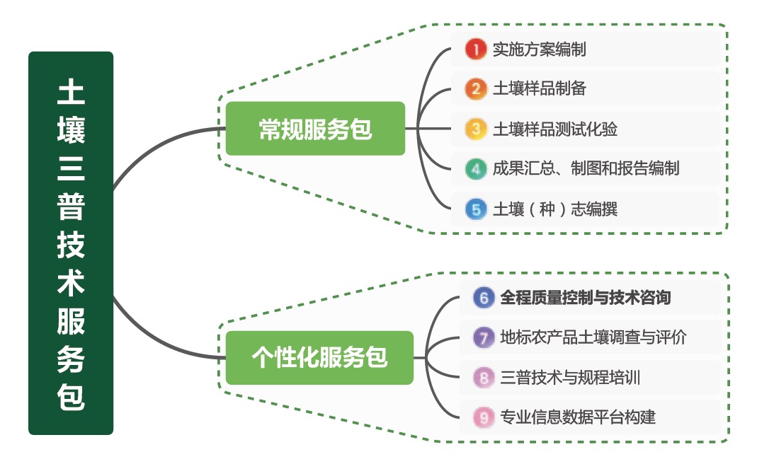 土壤“三普”技术服务团队可为第三次全国土壤普查提供各类技术服务,并根据工作内容和特点,形成常规技术服务和个性化技术服务两大类服务包。其中常规技术服务包共有5个服务子包,涵盖了第三次全国土壤普查的大部分工作内容,个性化技术服务包则根据地方土壤普查的个性化需求提供了4个服务子包,具体三普技术服务内容见下图。