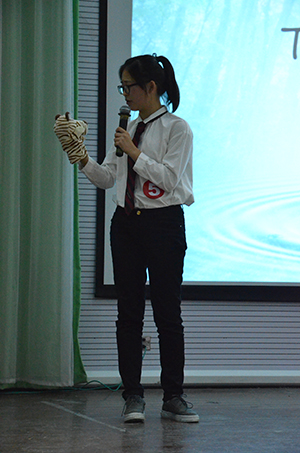 资环151的邓钰华同学以“How NJAU has changed me”为主题,向大家讲述了她在这两年的南农生活中的成长历程。来自环科151的沈越同学将自己失败的演讲经历作为开场白,又接连引用J·K罗琳、亚伯拉罕·林肯的故事,来告诉大家面对失败不要郁郁寡欢,而是要从中汲取经验以期下一次的成功,就像她的演讲主题“Just say hi,give it a hug and then learn from it”。电影配音环节中,沈越同学用流利又富有感情的英语为电影《马达加斯加企鹅》中的一个片段配音,获得了全体在场老师同学的掌声。才艺展示环节,一曲The show 伴随着大家有节奏的掌声,将全场的气氛推向高潮。评委提问环节,她从容应对,赢得了全体评委的一致好评。资环131的孙光稷同学,利用“Simulation Theory”对自己的观点“What we do Affects the outcome”加以佐证,令大家眼前一亮。评委提问环节,他用幽默的方式表达了他对美国大选的看法,令大家忍俊不禁。来自资环162的闾婧妍同学,一开场就用发音准确,吐字清楚的英语折服了到场的观众和评委,她多次说道“This is my university”,字里行间透露出她对日本a片