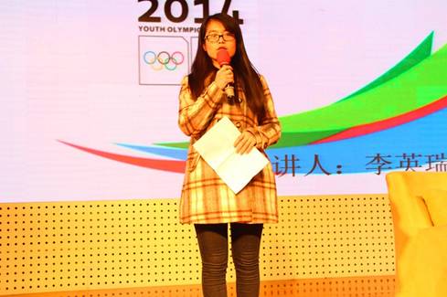 志愿者代表李英瑞分享了她“暑期三下乡社会实践活动”、“亚青会”和“青奥会”志愿者的经历,从她身上体现出志愿服务工作温暖他人也温暖自己的深刻含义,也让自己更多的去运用知识,了解世界。只有实践才会发现不一样得天空,这就是青春的价值。