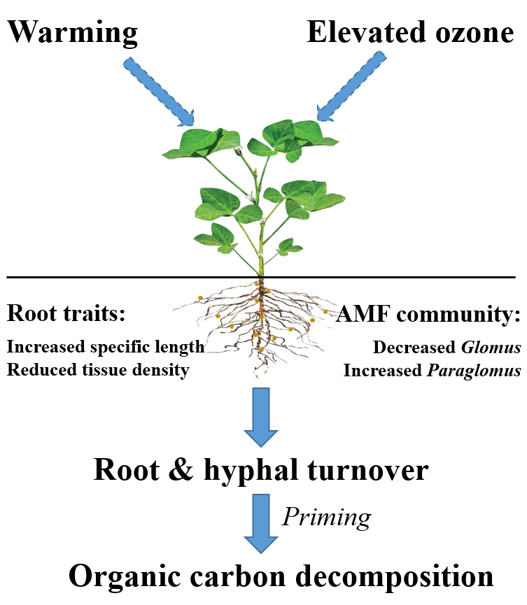 该研究基于美国北卡罗来纳州立大学的长期定位试验,发现在免耕的大豆农业生态系统中,增温与高臭氧浓度增加了植物胁迫,减少光合产物向地下分配,改变植物根系性状与营养获取策略。为了确保营养获取,植物调整了根系结构与AMF的组成:为维持吸收面积,以牺牲根的“强度”为代价,根变得更细更疏松,菌丝也变细,由此导致根与菌丝更为脆弱,周转速率加快,增加能量源并激发微生物分解土壤有机碳;同时,AMF群落中具有更高养分吸收能力的Paraglomus属相对丰度增加,而具有土壤有机碳保护能力的Glomus属相对丰度降低。这些结果揭示了气候变化改变根系性状与菌根真菌组成从而加速土壤有机碳分解的新机制。