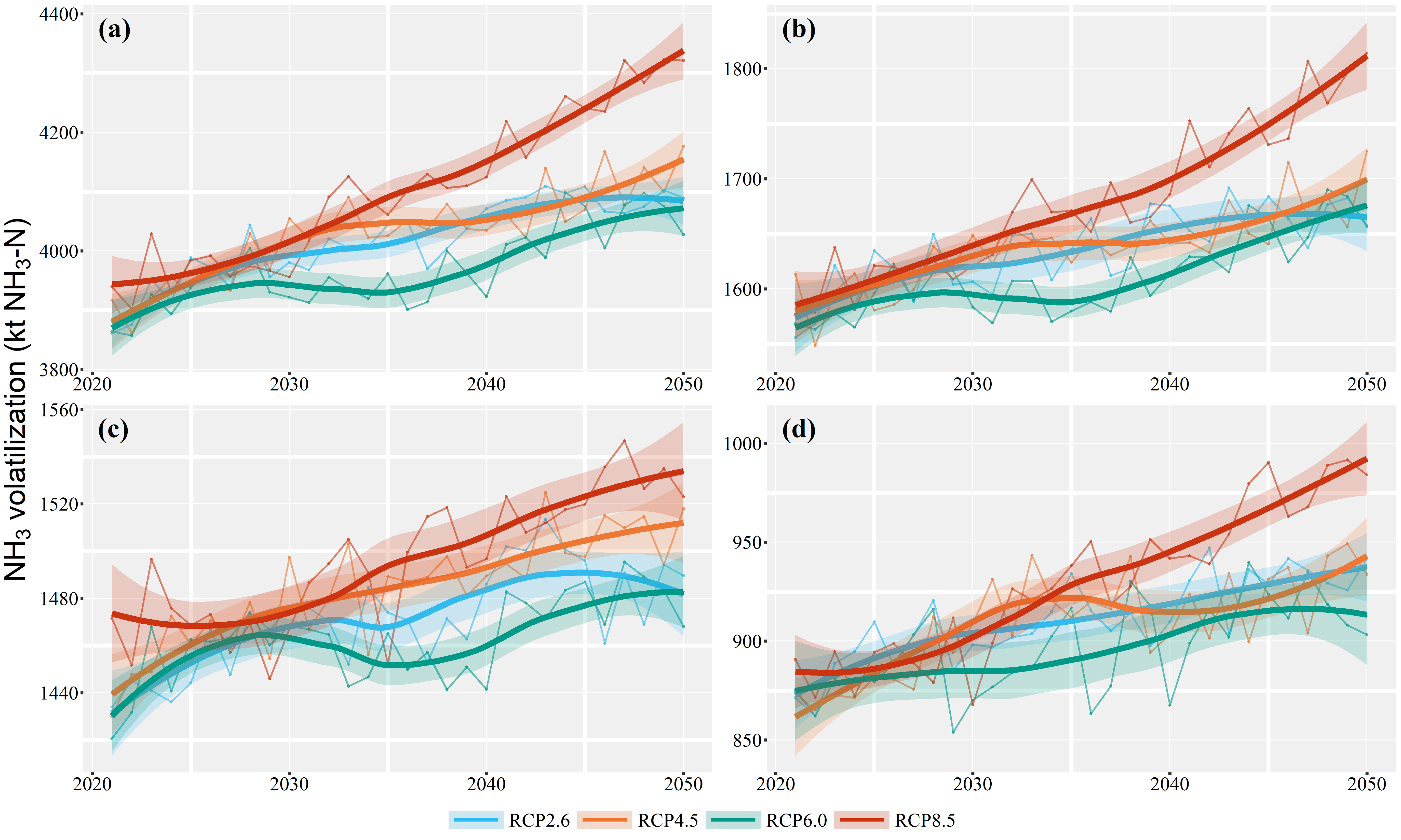 图2不同气候变化情景(RCPs)下中国主要粮食作物氨挥发年际变化(a,三大作物之和; b,水稻; c,玉米; d,小麦)