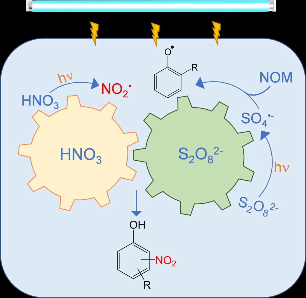 陆隽鹤教授课题组发现在紫外活化过二硫酸盐(UV/PDS)氧化过程中,NO3‾的存在可导致具有“三致”毒性的硝基芳香化合物的生成。
