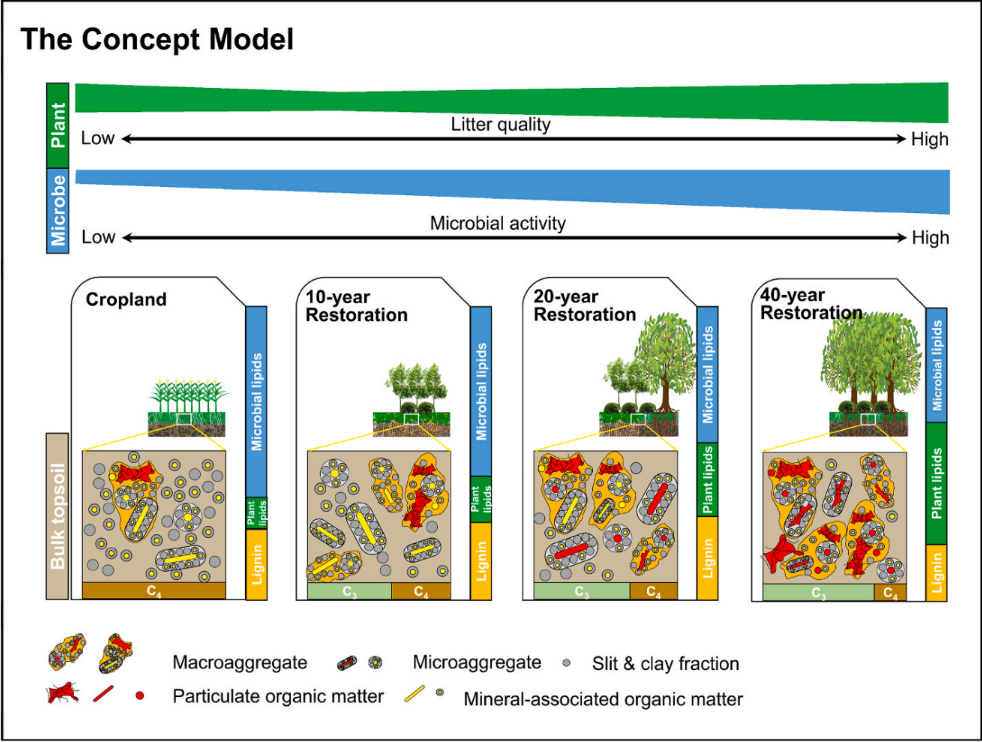 本研究表明,森林恢复中喀斯特土壤有机质快速积累,主要表现为宏团聚体发育加快,颗粒态碳和植物源有机碳组分被保护,有机碳趋向于年轻和活性。换句话说,退化土壤中的少量有机质,类似于消瘦的动物机体,以难啃的骨头(老碳)为主,有机质缺乏多样性;而食物供应充分下,摄食各种外源食物进入体内,体重不断增加,以肥肉(类似POM)增加为特征,新增的似乎是“小鲜肉”,新鲜、营养好,但是被保护而免受微生物分解。有机质严重缺失的退化经植被恢复,有机质体量(含量)增加,不再是“骨瘦嶙峋”,而是“肉”“骨”不断协调,趋向于碳库分配的多样化和碳源分子的多样化(图1)。
