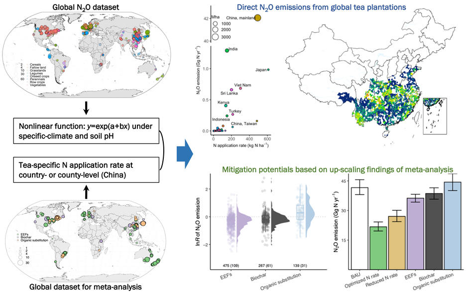 氧化亚氮(N2O)是大气中仅次于二氧化碳和甲烷的第三大温室气体,主要来自于农业。减少农业部门N2O排放对实现《巴黎协定》设定的1.5℃控温目标至关重要。准确估算管理土壤N2O排放是设计和实施减排策略的前提。酸性土壤是大气N2O排放的热点区域。由茶树自身和外界因子共同导致茶园土壤酸化问题日益突出。而且,为了追求高产,茶树种植过程中普遍存在化肥过量施用的现象。然而,关于全球茶园种植因施肥引起的N2O排放总量及其减排潜力尚不清楚。