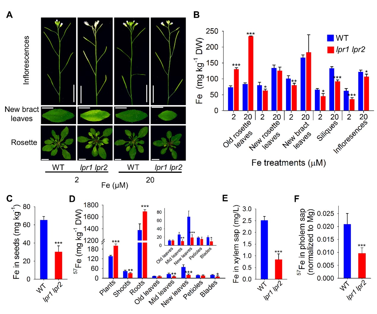双敲除LPR1和LPR2导致铁沿着维管组织沉积,降低了木质部汁液中铁的浓度,减少了铁从根系向地上部和从叶柄向叶片的转运,降低了韧皮部铁的浓度及向新生器官的分配,铁更易在老叶中积累,向新生器官的分配减少(图2),从而诱发持续性的缺铁响应信号,根系参与铁吸收的相关基因表达大幅度上调。因此,lpr1 lpr2双敲除突变体呈现两个貌似互相矛盾的表型:在低铁供应条件下,lpr1 lpr2的新生器官和花序出现明显的缺铁黄化现象,铁在种子中的含量显著下降(图2A-C);而在正常或高水平铁供应下,持续性的缺铁响应导致lpr1 lpr2体内尤其是老叶中铁过量积累,产生毒害,抑制植物生长(图1A)。