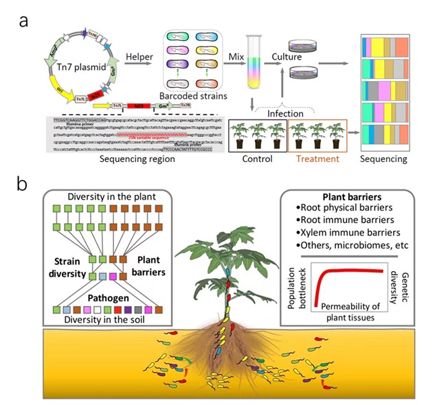 沈其荣院士团队LorMe实验室与西南大学张勇教授(资源环境学院/长江经济带绿色农业发展研究中心)合作的最新研究成果《Effects of plant tissue permeability on invasion and population bottlenecks of a phytopathogen》。该研究通过建立等位基因标记技术,动态示踪微生物种群变化,突破了根际入侵过程中无法精细刻画致病菌种群演替的关键技术瓶颈,解析了根际免疫制约土传致病菌入侵的过程与微生态机制,为土传致病菌的生态阻控提供理论和技术支撑。