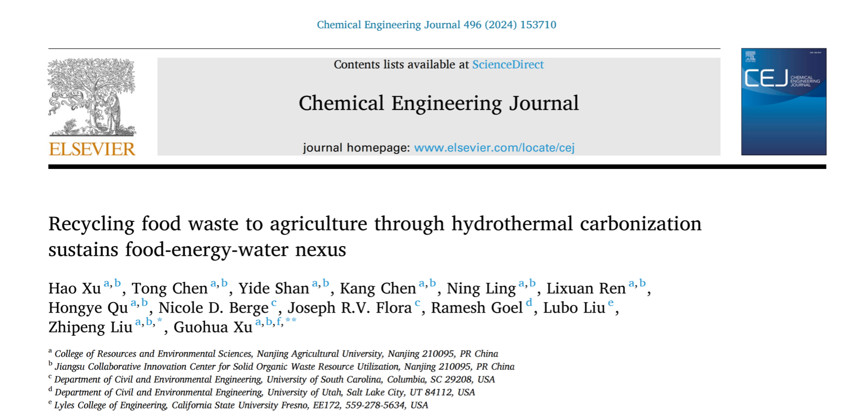Xu, H., Chen, T., Shan, Y., Chen, K., Ling, N., Ren, L., Qu, H., Berge, N., Flora, J., Goel, R., Liu, L., Liu, Z.*, Xu, G,**. (2024) Recycling food waste to agriculture through hydrothermal carbonization sustains food-energy-water nexus. Chemical engineering journal, 496, 153710. //doi.org/10.1016/j.cej.2024.153710.