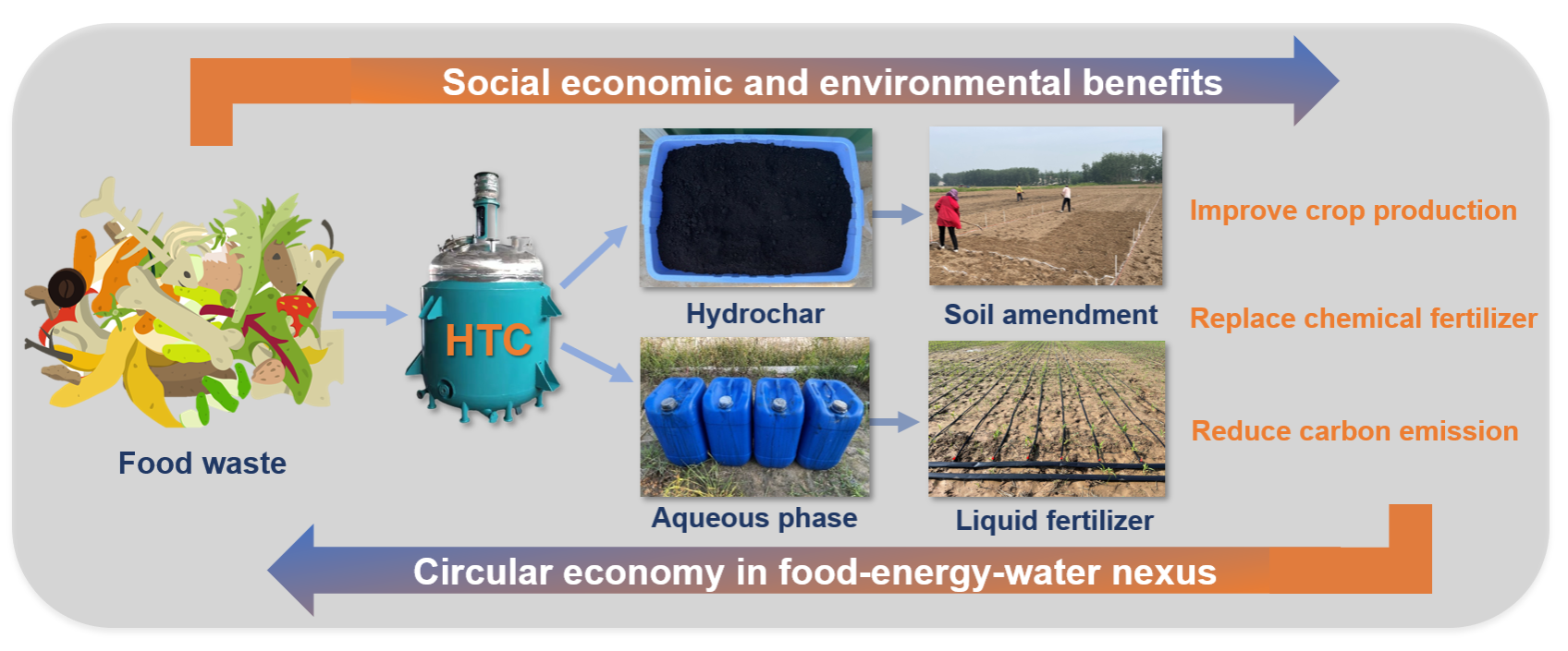 在推动食物-能源-水系统循环经济方面,厨余垃圾HTC产物在农业上的循环利用被认为具有巨大潜力。然而,由于缺乏面向生产应用尺度的研究,国内外对HTC规模化处理厨余垃圾的工艺流程、产物还田对作物生长和产量的影响、可能产生的生态环境效应以及经济可行性并不清楚。