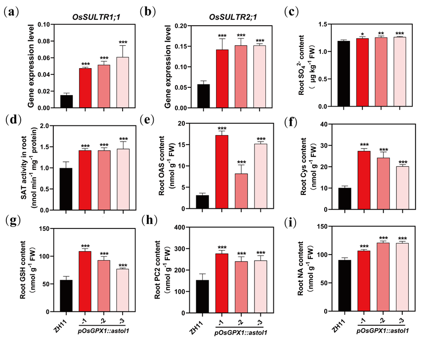 图1 水培试验中表达pOsGPX1::astol1对水稻硫吸收同化和烟酰胺合成的影响。(a, b) 野生型(ZH11)和pOsGPX1::astol1株系根系OsSULTR1;1 (a)、OsSULTR2;1 (b)的表达水平;(c-i) 野生型(ZH11)和 pOsGPX1::astol1株系正常培养条件下根系的硫酸盐含量 (c)、总SAT酶活 (d)、OAS含量 (e)、Cys含量 (f)、GSH含量 (g),5 μM As(III)处理条件下根系的PC2含量 (h),正常培养条件下根系的NA含量 (i)。