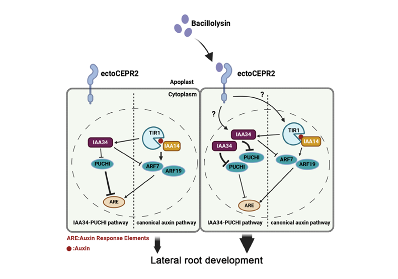 沈其荣院士团队张瑞福教授课题组的最新研究成果“A rhizobacterium-secreted protein induces lateral root development through the IAA34-PUCHI pathway”。该研究发现典型根际益生菌Bacillus velezensis SQR9能不依赖于经典生长素信号通路中ARF7和ARF19转录因子促进植物侧根发育,进而利用生物活性追踪法从菌株SQR9发酵液上清中分离纯化到发挥作用的蛋白bacillolysin,bacillolysin的根系受体为CEPR2,通过调控非经典生长素信号途径“IAA34-PUCHI”模块促进植物侧根发育。本研究表明根际微生物可以分泌活性物质调控植物的根系发育,为植物-微生物互作提供新的模式,并从根际微生物的角度揭示植物根系发育的新机制。