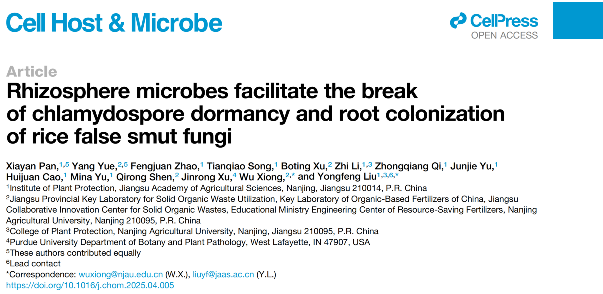 沈其荣院士团队熊武教授与江苏省农业科学院刘永锋研究员团队合作,在国际权威期刊《Cell Host & Microbe》发表题为“Rhizosphere microbes facilitate the break of chlamydospore dormancy and root colonization of rice false smut fungi”的研究论文。该论文系统性阐明了根际微生物调控稻曲病菌厚垣孢子打破休眠萌发并在水稻根部定殖机制,揭示了长期困扰行业领域内的“侵染源之谜”,证实了土壤中越冬后的厚垣孢子是稻曲病重要初侵染来源,为水稻抗病种质资源挖掘和病害的绿色防控提供了重要理论依据。