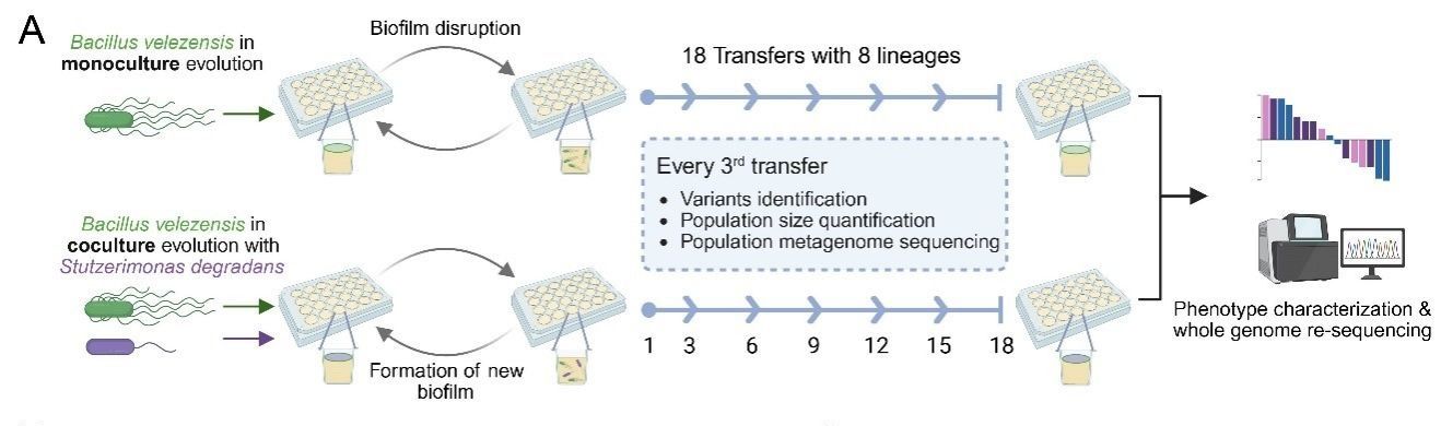 本研究从实验进化角度揭示了种间互作如何塑造微生物群落的进化路径与表型分化,为理解多种群微生物社会进化提供了新视角,也为农业和环境微生物群落的定向调控提供理论参考。