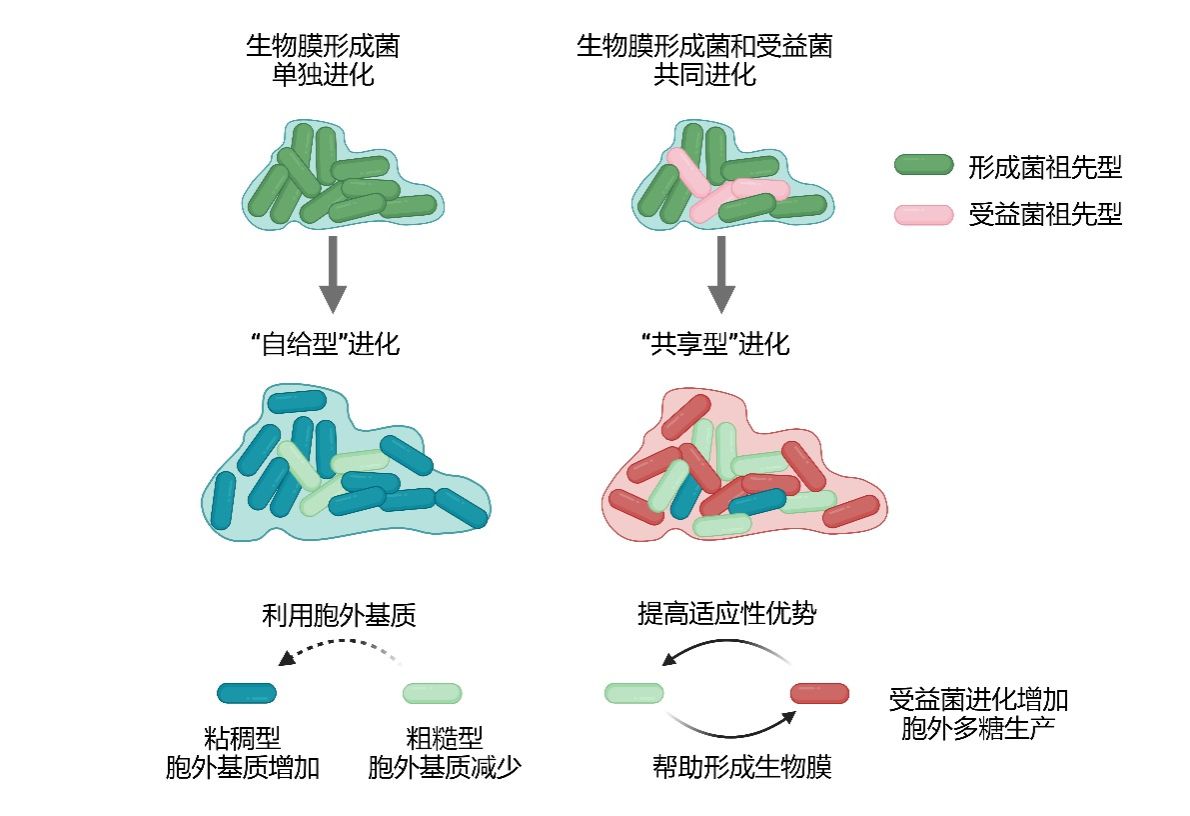 在自然界和农业生态系统中,微生物群体普遍以生物膜(Biofilm)这一功能化聚集体形式定殖共存,系统解析生物膜微环境内微生物间的互作模式及其共进化动态特征,是阐明微生物群落生物学功能的关键理论支撑。生物膜由微生物细胞及其分泌的胞外基质构成,其中的胞外多糖等“公共物品”支撑着生物膜的稳定性。不同菌株在生物膜中既可能形成互利合作,也可能因资源竞争和利用者(exploiter)的出现而改变群落结构和进化方向。尽管单菌生物膜的实验进化已有大量研究,但在多菌共存环境下,受益菌(无法单独形成稳固生物膜)如何影响生物膜形成菌的进化轨迹仍不清楚。