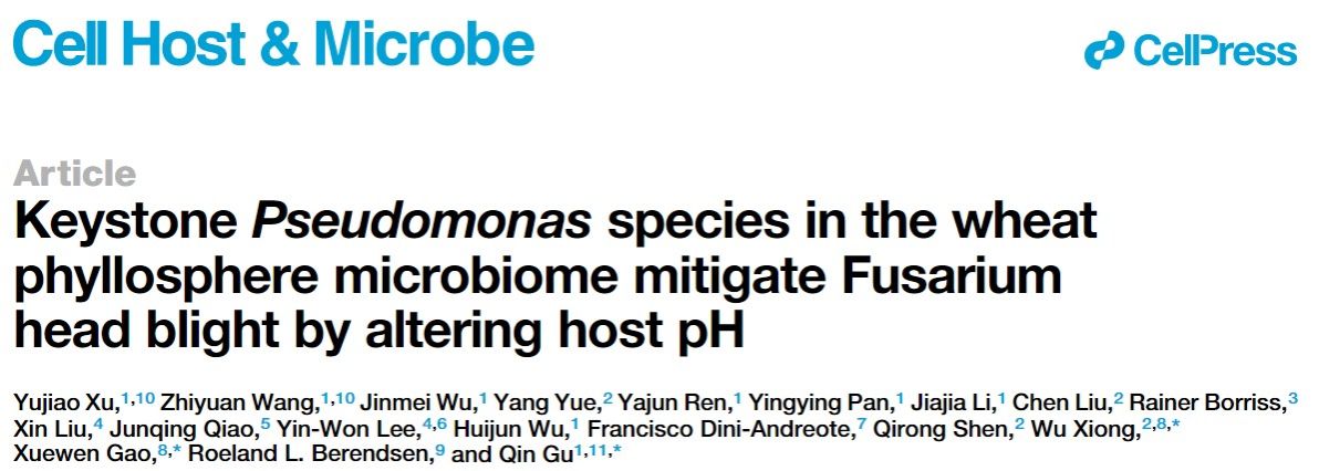 沈其荣院士团队熊武教授与植保学院高学文/顾沁教授团队合作,在微生物学领域国际权威期刊《Cell Host & Microbe》发表题为“Keystone Pseudomonas species in the wheat phyllosphere microbiome mitigate Fusarium head blight by altering host pH”的研究论文。小麦赤霉病是威胁全球农业生物安全的重大真菌病害。赤霉病菌侵染小麦时,会通过诱导寄主碱化来增强自身致病力。与此同时,小麦穗部的天然微生物群落中潜藏着一类能够“以酸制碱”的守护者——寄主酸化型假单胞菌。这些细菌在赤霉病菌侵入时被招募至麦穗,分泌有机酸降低病原菌诱导的寄主碱化效应,从而有效抑制赤霉病的发生。该研究揭示了寄主、病原菌与有益微生物间围绕pH的精妙博弈,并展示了通过调控寄主微环境实现作物绿色防控的新思路。