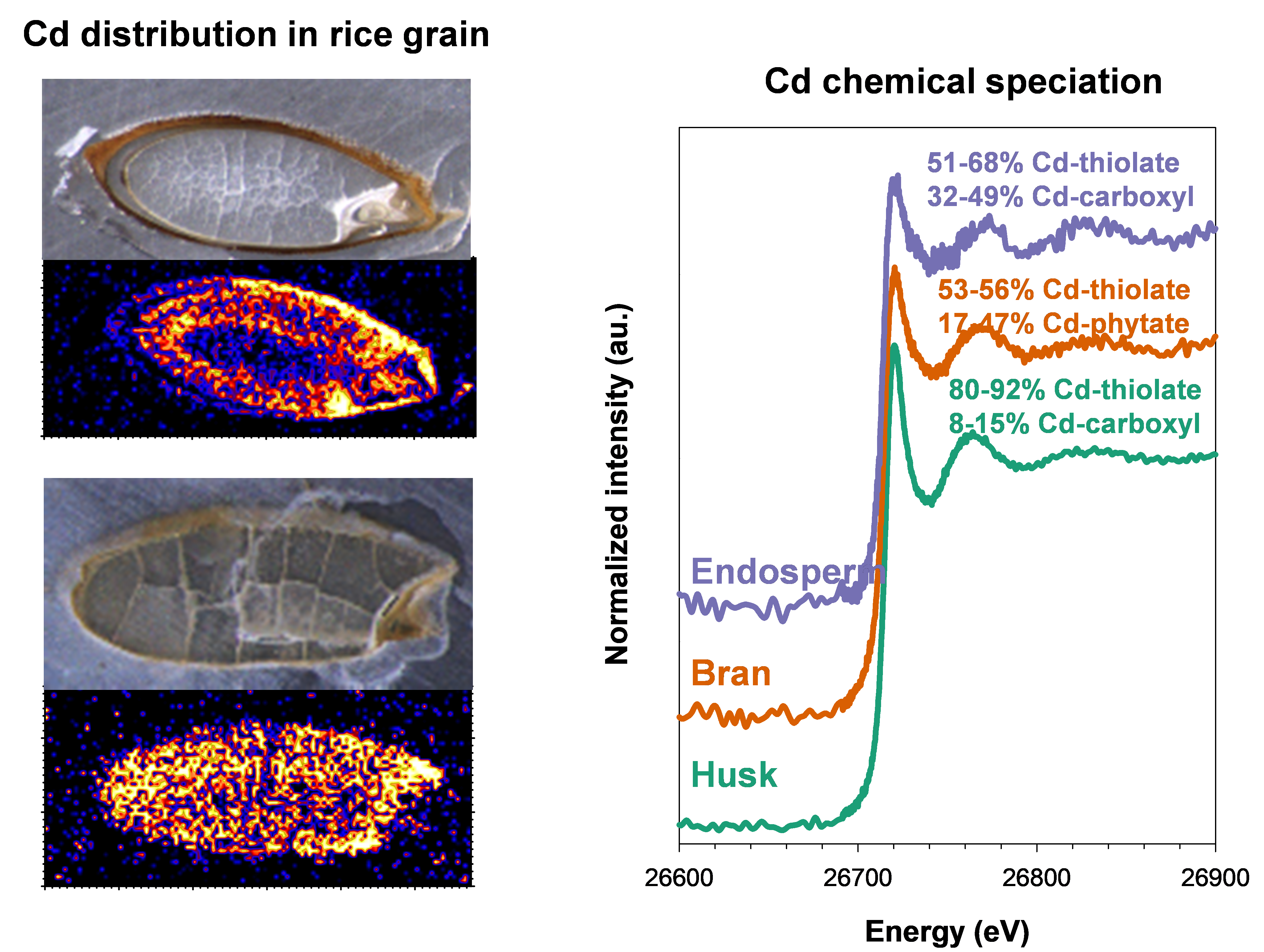 环境生物学团队利用同步辐射X射线吸收光谱和X射线荧光显微成像技术,研究了镉在稻米中的化学形态和空间分布。研究发现稻米中镉主要是与巯基化学功能团结合(66-92%),主要可能以含巯基蛋白结合形式存在。元素的荧光成像分析表明稻米中镉的空间分布模式多样,具有不确定性,主要取决于水稻灌浆期土壤溶液中镉的动态变化,如在灌浆初期稻米糊粉层形成时,土壤溶液中镉浓度较高,那么镉在糊粉层中含量则高;如灌浆后期土壤溶液中镉浓度较高,那么中心淀粉胚乳细胞镉含量则高。